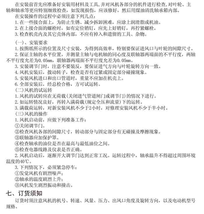 一、風(fēng)機選用參考、安裝維護使用說明、常見故障分析、訂貨注意事項